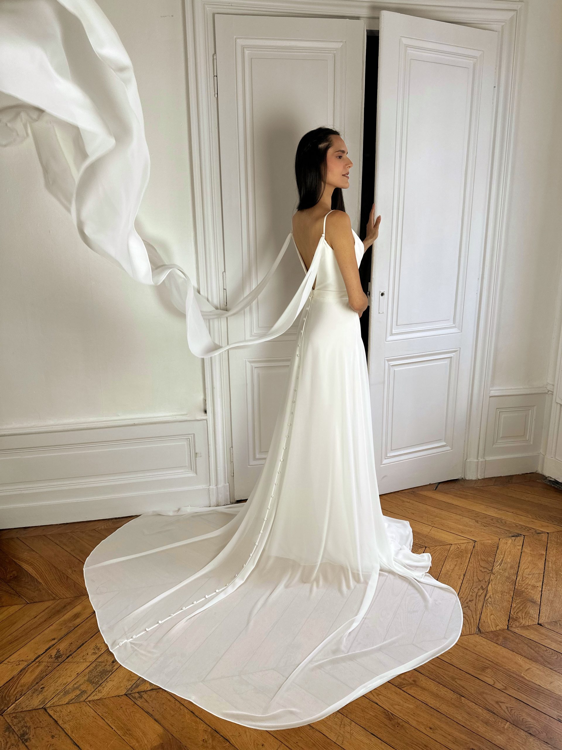 Vous souhaitez personnaliser votre tenue ? De longues capes amovibles peuvent être ajoutées aux épaules. Elles offrent une allure poétique et font toute la différence pour une cérémonie en extérieur.