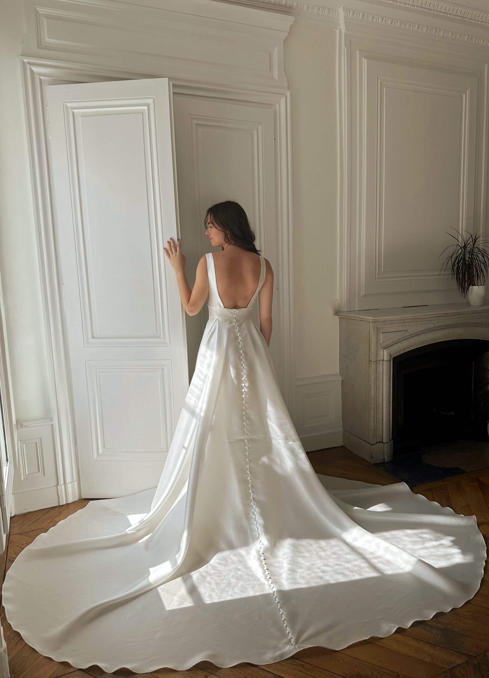 Nos mariées cherchent également : robe de mariée simple, robe de mariée avec fente, robe satinée épurée, robe dos nu, robe minimaliste avec traîne, robe moderne sur mesure Lyon.