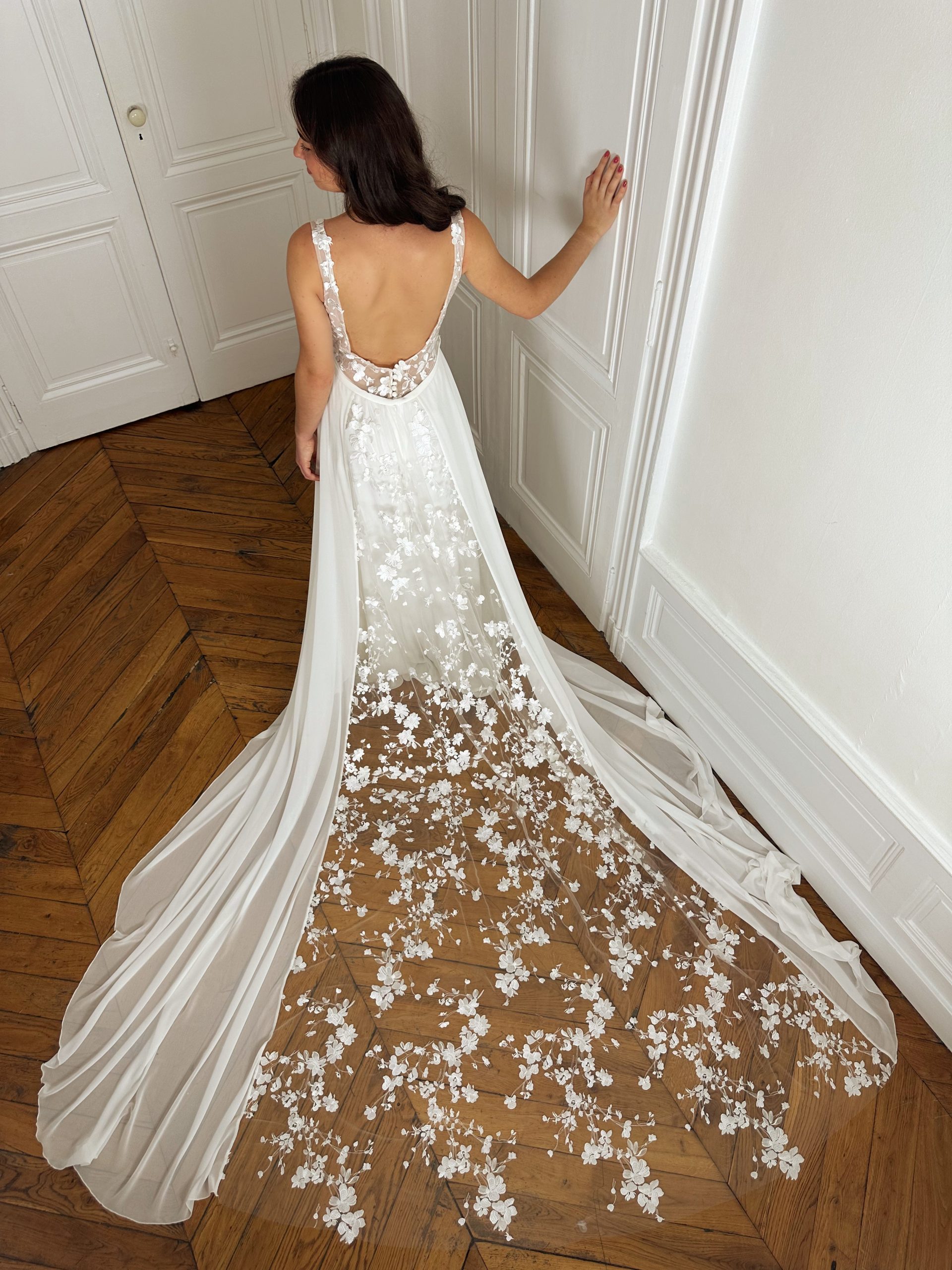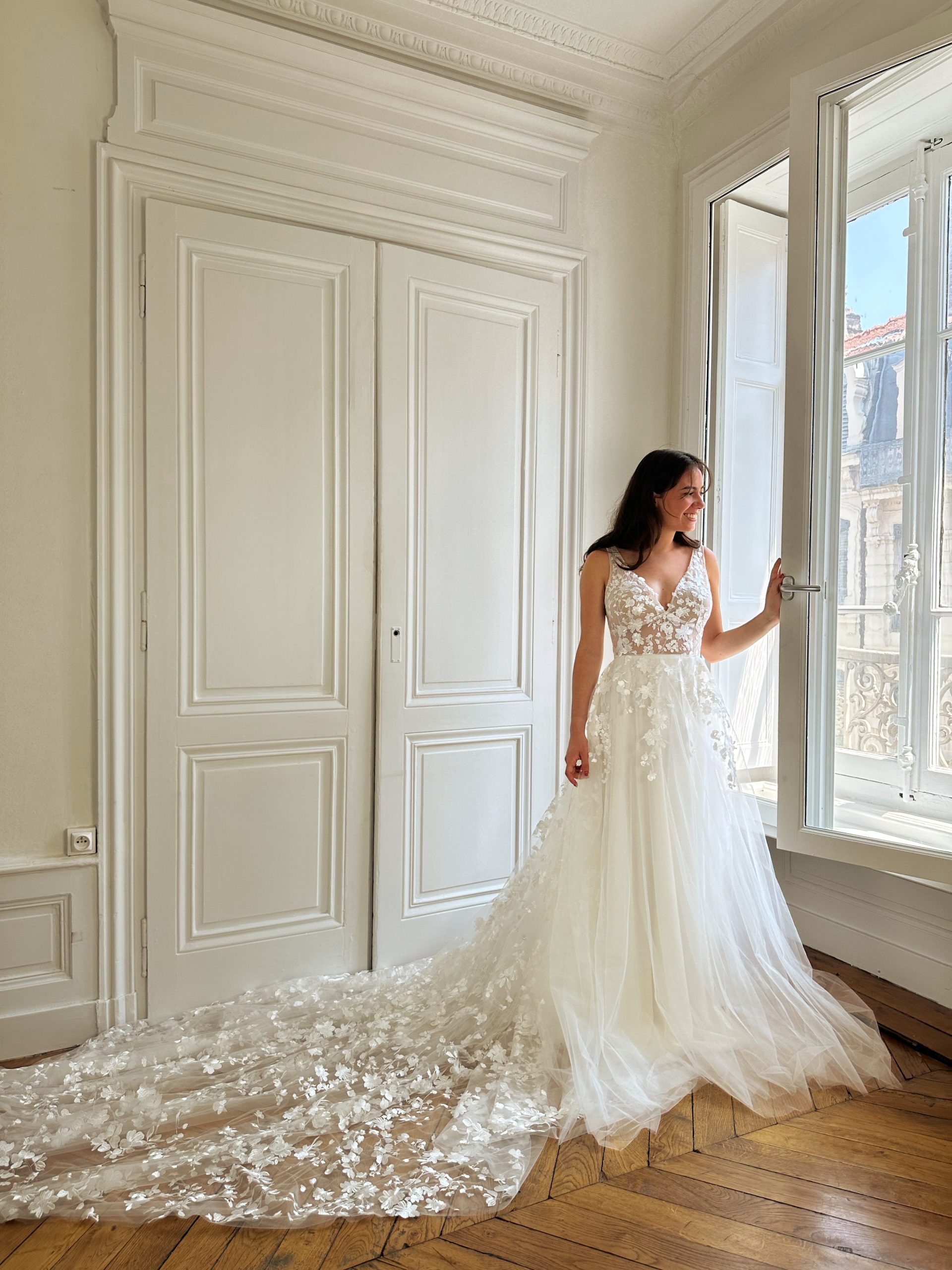 Prenez rendez-vous dans notre boutique à Lyon pour essayer cette création unique et découvrir la traîne qui sublimera votre silhouette.