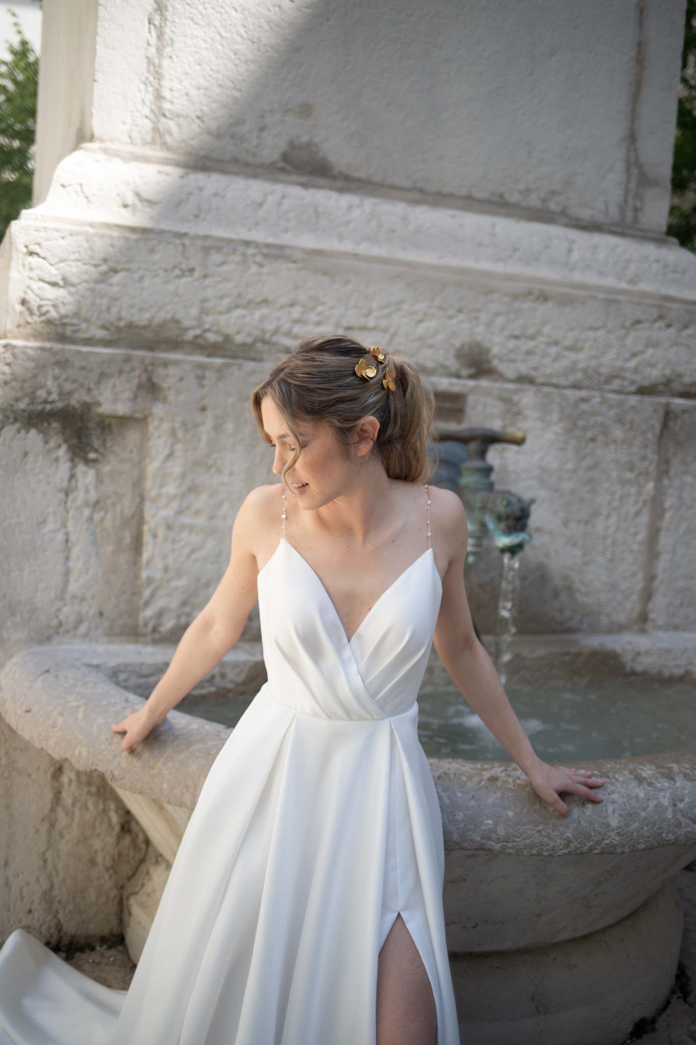 La robe Promesse en Perles incarne l’élégance dans sa forme la plus pure. Sa silhouette combine une coupe princesse légère avec une fente discrète, pour un équilibre parfait entre grâce et modernité. Le corsage, drapé en diagonale, flatte le buste et marque délicatement la taille. Les bretelles fines, ornées de perles, ajoutent une touche précieuse.