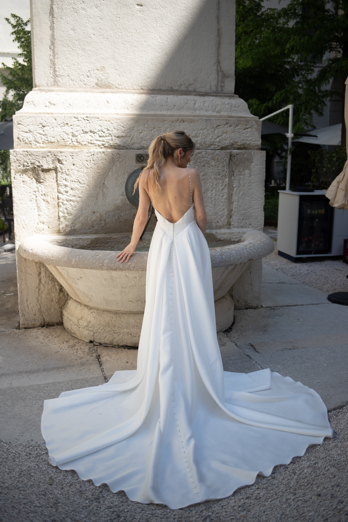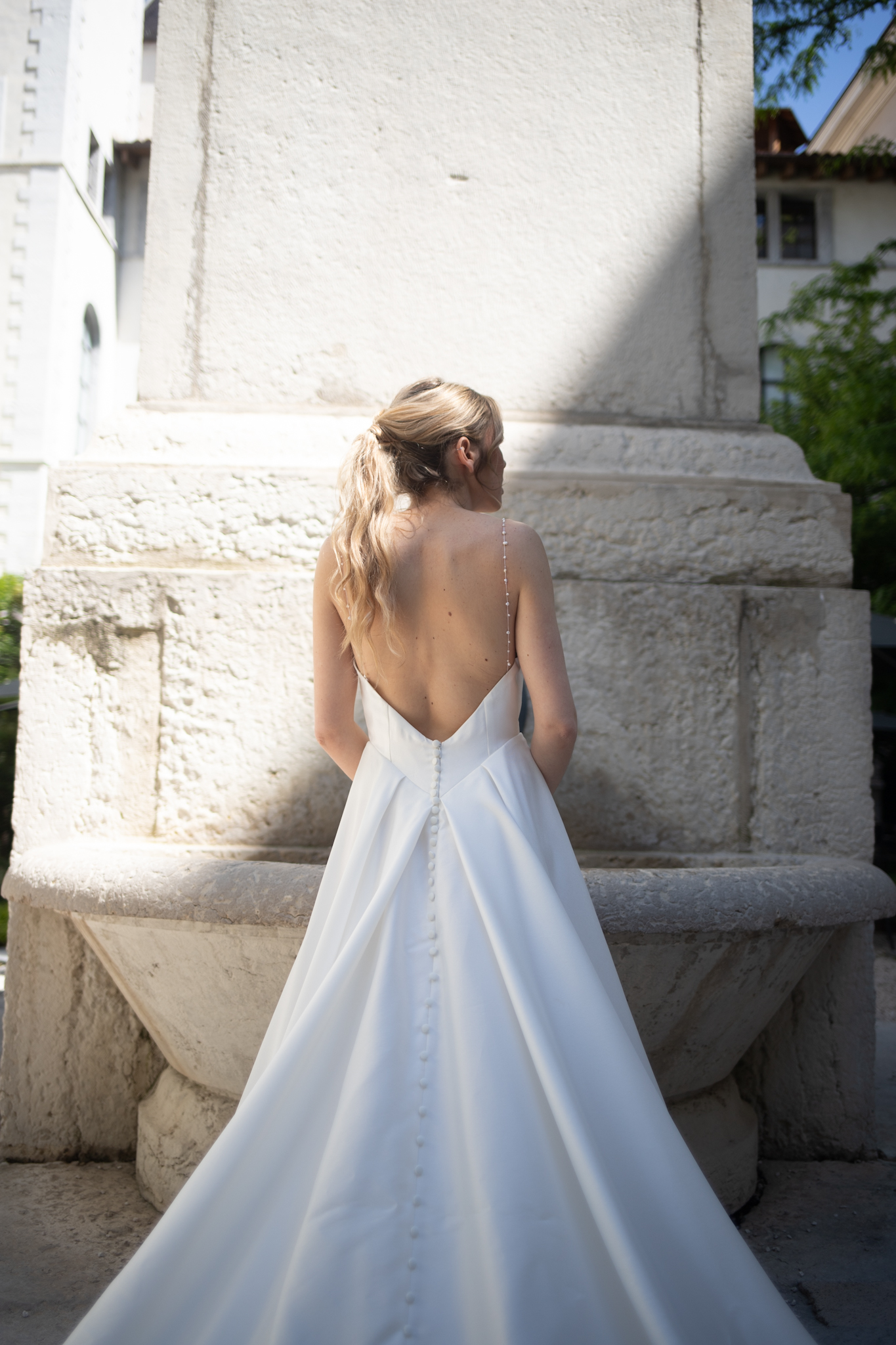 À l’arrière, un dos nu dévoile la peau avec subtilité. Une rangée de petits boutons recouvre la fermeture et souligne le raffinement du modèle. Enfin, la traîne fluide s’étire avec légèreté, sublimant